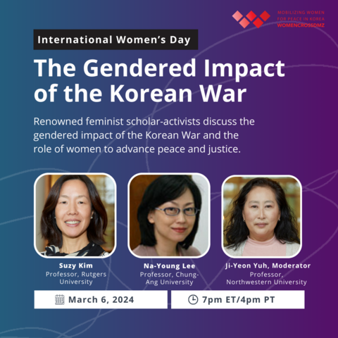 The situation on the Korean Peninsula is the most dangerous since the Korean War as multiple conflicts have erupted around the world. In recognition of International Women’s Day, join a webinar with two renowned feminist scholar-activists whose work sheds light on the gendered impact of the Korean War and the role of women to advance peace and justice. Suzy Kim, Professor of Korean History at Rutgers University, will provide a historical account of how North Korean and international women intervened during the Korean War based on her 2023 book, Among Women Across World: North Korea in the Global Cold War. Na-Young Lee, a professor at Chung-Ang University, will provide insight on the impact of the ongoing war on South Korean women, including militarized sexual violence, and the efforts underway in South Korea to hold the ROK government and U.S. military accountable. Women Cross DMZ’s Echo Cho will provide an update of the organizing underway by the Korea Peace Now! Grassroots Network in the U.S. towards ending the Korean War. The event will be moderated by Northwestern University professor Ji-Yeon Yuh, Women Cross DMZ Board Member.