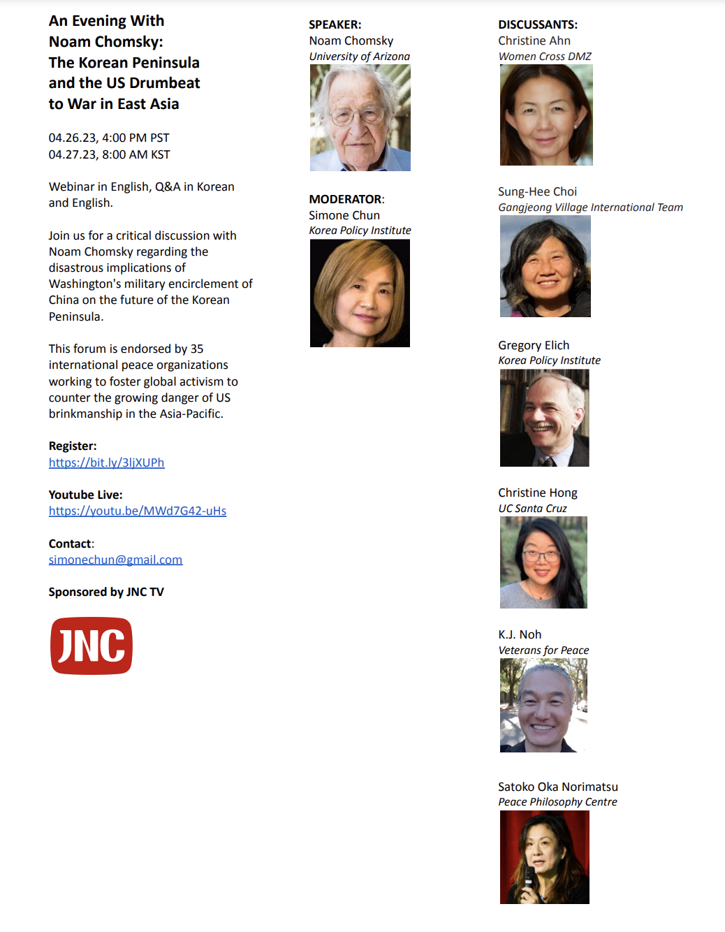 Join us for a critical discussion with Noam Chomsky regarding the disastrous implications of Washington’s military encirclement of China on the future of the Korean Peninsula. This forum is endorsed by 35 international peace organizations working to foster global activism to counter the growing danger of US brinkmanship in the Asia-Pacific region.