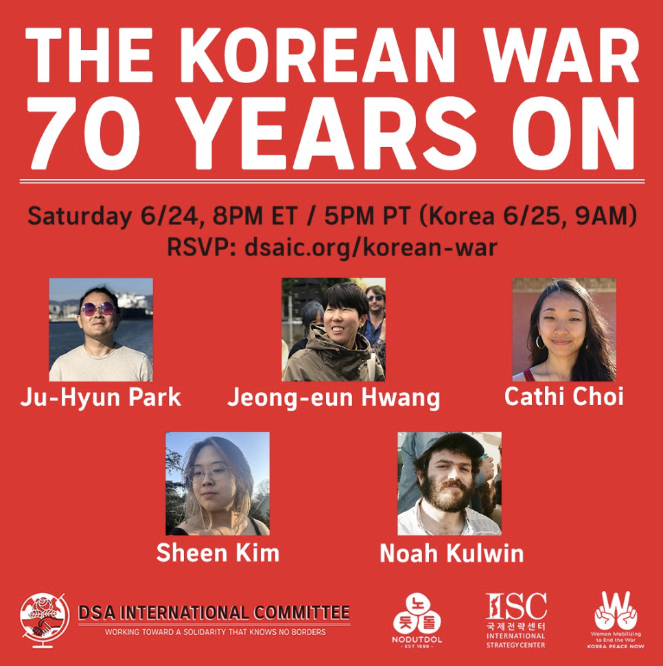 70 years have passed since the signing of the Korean Armistice Agreement, yet the Korean War never officially ended and the US continues its military occupation and brinkmanship on the Korean peninsula. Join DSA IC with the the host of Blowback to hear from Korean organizations and activists from the US and South Korea who will speak on the history and impacts of the war and the possible solutions for organizing toward peace, while countering US-centric narratives that often distort the historical outlook on the war.